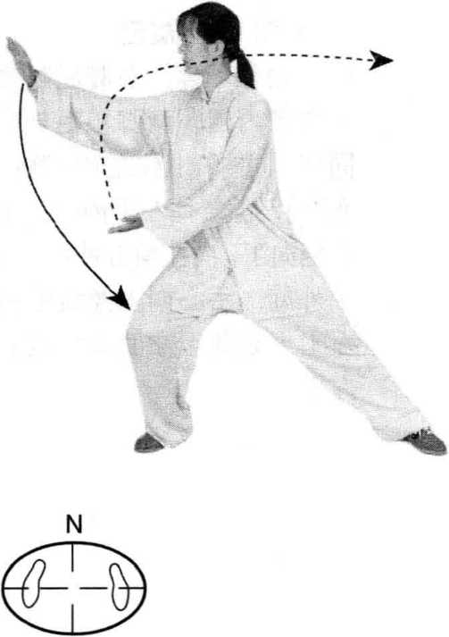动作不停,右脚屈腿收 至左脚内侧,两脚相距同肩 宽;同时,上体左转(胸向东 南),左手内旋,手心翻向下, 向左前方伸出;右手外旋,手 心向上,经腹前向左上方划 弧至左肋前;眼看左手。
