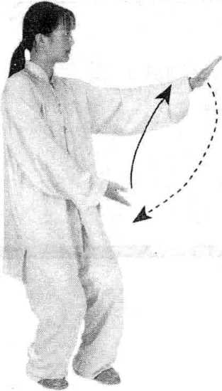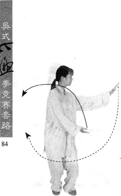 右脚尖稍外摆踏实,重 心右移;左脚向左开步,脚 跟着地;同时上体右转(胸 向西南);随转体右手向上 经面前向右划弧举至右肩 前,腕略高于肩;左手向下 划弧经腹前至右肋前;眼看 右手。