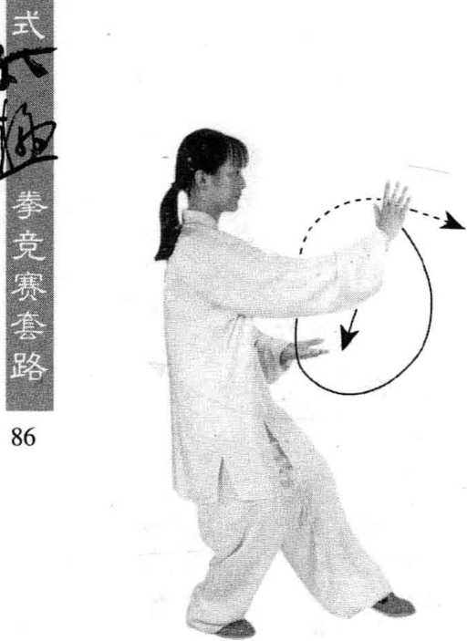 左脚尖落地踏实,重心 左移;上体左转(胸向南)成 左横弓步;同时,左手向上经 面前向左划弧举至左肩前上 方,腕略高于肩;右手向下、 向左划弧落于右胯旁。