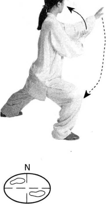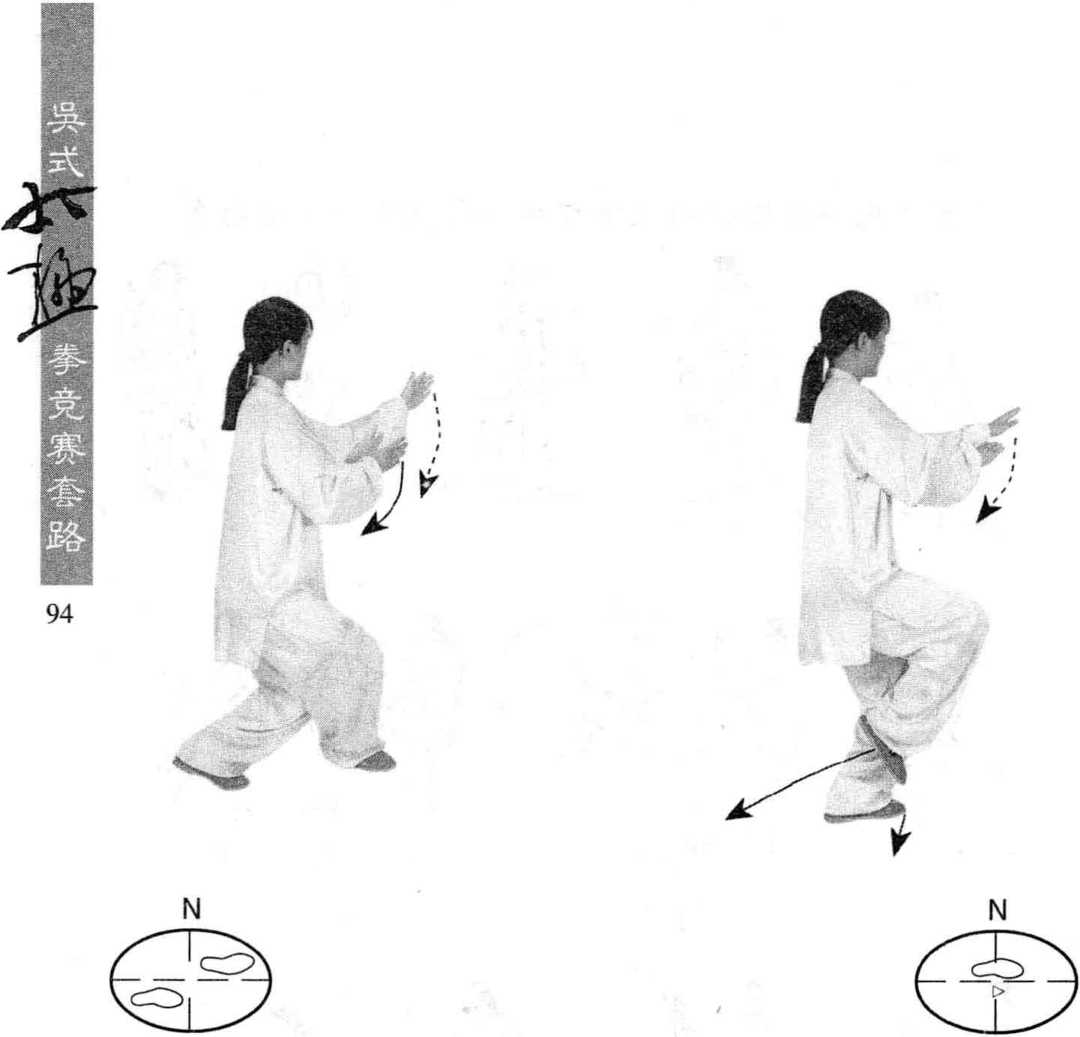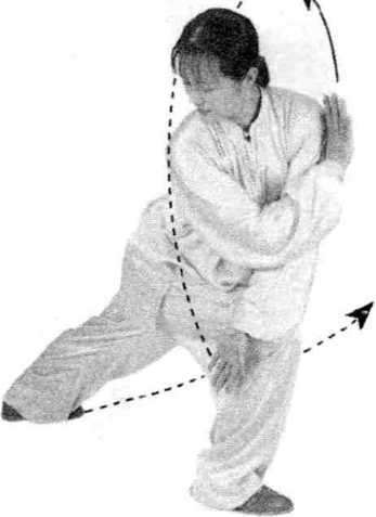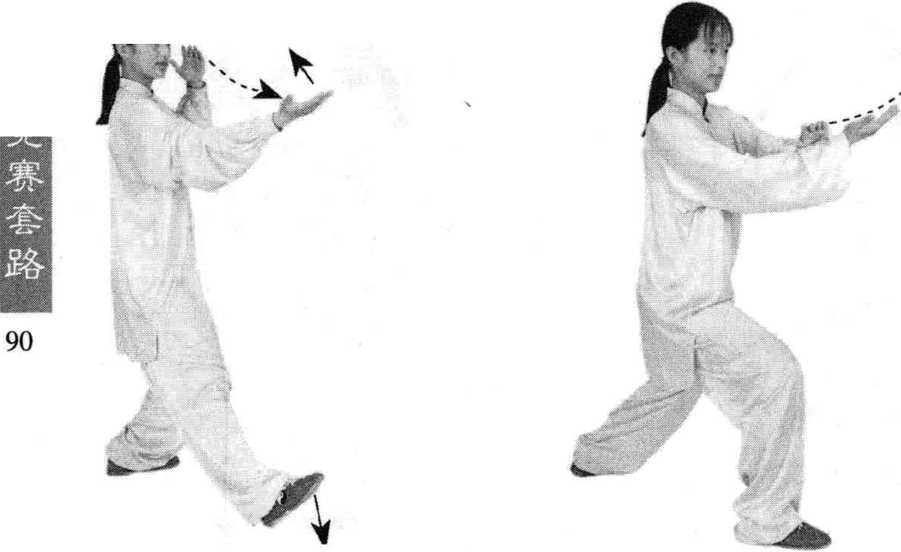 左腿屈膝;同时右腿屈 膝向右前方落步,脚跟着地; 右手下落,手心向上置于腹 前;左手屈肘收于左耳侧,手 心向下;接着,重心前移,右 脚尖稍内扣落地踏实;同时 右手回收;左手前伸,使两手 在腹前相合,左手在上,两手 手心斜相对;动作不停,重心 继续前移成右弓步;上体随 之左转(胸向东北);同时, 左手经右向前、向左上方划 弧伸至左前方(东北),腕略 高与肩,手心斜向前;右手 随左手动作方向划一小弧后 屈肘回收附于左前臂下,手 心向上;眼看左手。