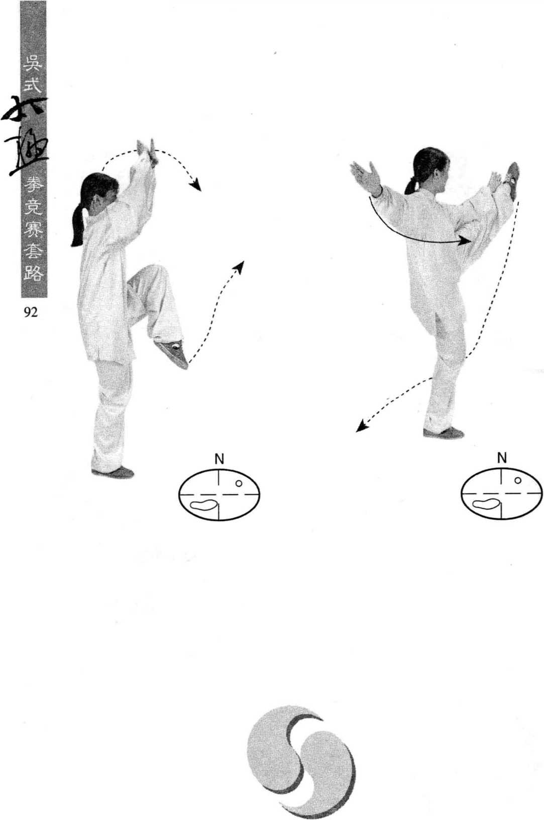 左腿伸膝独立;右腿屈 膝前提起;上体右转(胸向 东);同时,右手臂向左、向 上经左手臂外侧向右上方划 弧,同左手臂一齐上举至额 前方,两手相搭,右手在外, 两手心均向前;接着,右腿向 右前方伸膝分脚,腿直,脚面 展平,脚高过腰;同时两手 臂向左、右分开,.右手与右 脚方向一致;左手落于体左 侧,腕略高于肩;眼看右手。