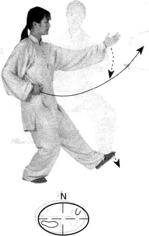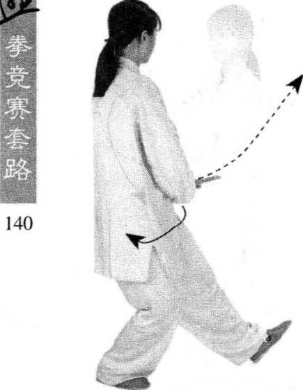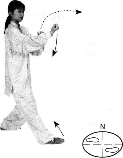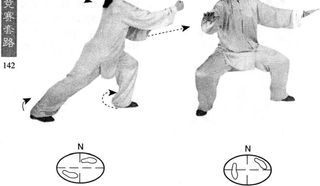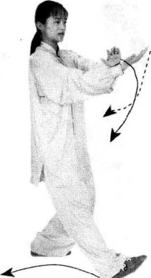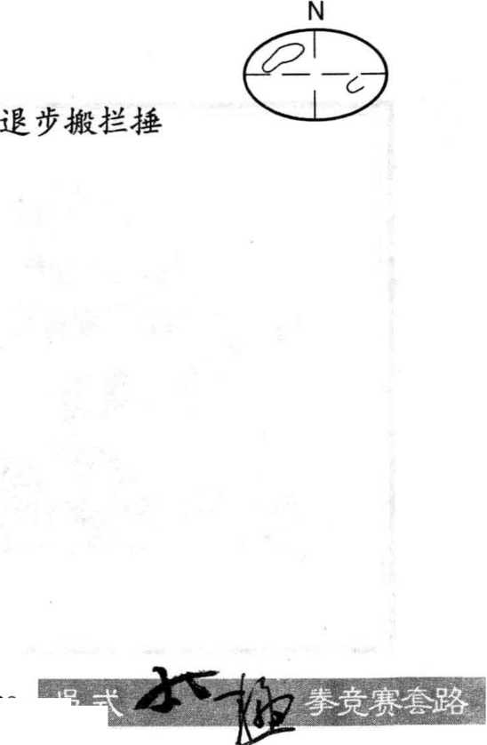 重心移向左腿,上体微 右转;右拳外旋下落至与肩 同高,手心向上;左拳变掌于 右前臂内侧;接着,重心后 移,右脚尖翘起;左手经右前 臂上,先稍向右再向前划弧 抹至胸前;右拳收至左腕内 侧;眼看左手。(2)退步下捋右脚向后撤一步;重心 后移,上体微左转;随之两手 向下、向左划弧收至左胯前。灌⑶后坐拦掌重心继续后移,左脚尖 翘起,上体右转;随之左手向 右、向体前推出,腕与肩同 高,手心向右,指尖向上;右 拳收至右腰侧,拳心向里;眼 看左手。