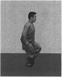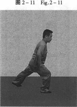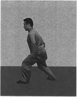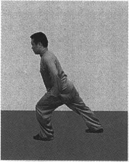 and knee and bend the knee. Meanwhile, push the right leg forward to transmit the force from the right foot to the knee, to the waist and hips and then to the left leg to form the bow stance. Adjust the breath while the whole body relaxing. This movement can be practiced repeatedly.