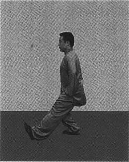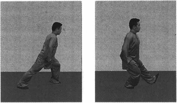 要点:由右弓步开始,右胯根里抽,全身向下松沉,重 心完全落于右脚,松左胯根,左大腿带动左小腿,左脚通 过身体的松沉,节节带动左腿,经过右脚内侧上步,脚跟 着地,松踝关节、膝关节、屈膝弓腿,同时右腿蹬地。劲力 由脚而膝而腰胯,传于左腿,形成弓步,全身继续松沉,调 整呼吸。此动作可以循环反复练习。