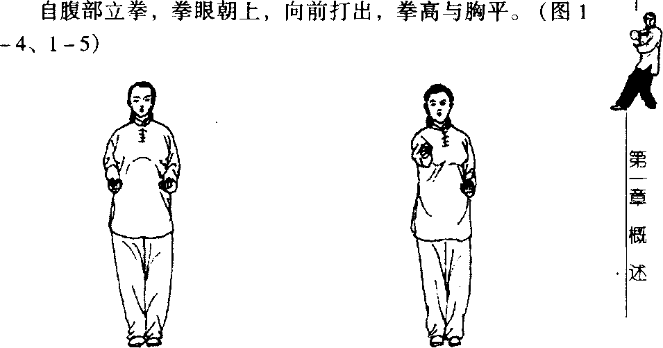 (―)冲拳图1-4 图1 -5。撇拳屈臂于胸前,拳心朝下,自异侧向上(高不过头)臂处旋 向同侧,弧形撇打,拳心朝上。(图1-6、1-7)(三)贯拳拳自下经两侧,臂内旋向前圈,贯扣腕,拳略高于耳,拳 眼斜朝下,臂呈弧形。(图「8、1-9)