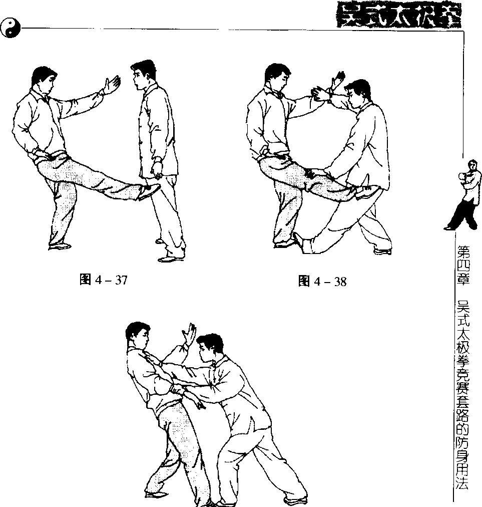 (一)名称释义此势名字来源于术语,即左足在前而推右掌,右足在前而 推左掌,则形成左右交叉式,术语称之为“拗步,拳法中讲 以手过膝盖或下按膝盖等动作为搂膝,是破敌进攻下路的方 法。(二)用法如对方用右足向我腹部踢来,我即在左掌对准其膝盖骨向 下按,使对方不踢则已,一踢即自行倒退而失败。其必然向前 下方落步,我当进左足紧贴其右足内侧,同时,发出右掌击其 胸或面部,这时对方即应手跌出。(图4- 37、4- 38、4-39)图 4一39