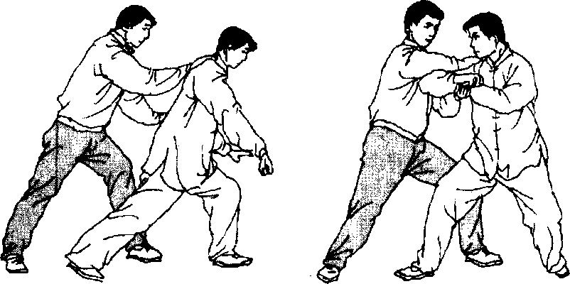 击法。另一方式,系以肩头作支点,将对方胳膊擎住,放在我 的肩上(以双手捋住对方腕部使成反关节),然后向下沉采, 同时转身使对方身体背势而不得力。
