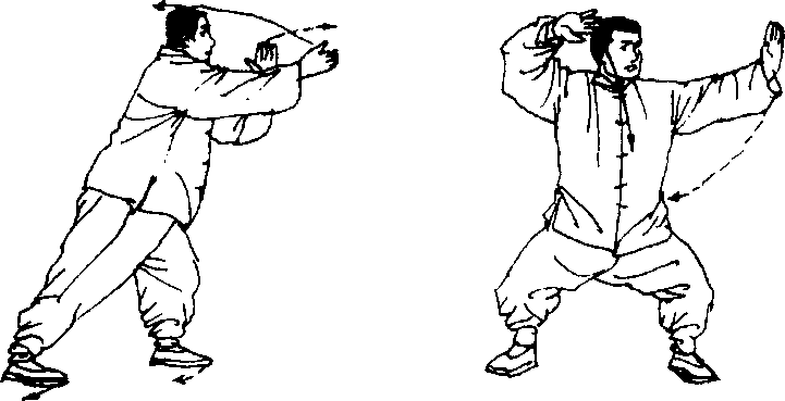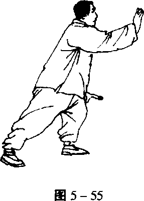 图 5 - 58 图 5 - 59方,转为掌心向外;左掌向前推出,目视左掌。(图5-59)