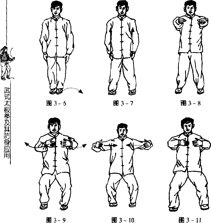 2 .身体重心微移向右脚,左脚向左开步,与肩同宽;眼 平视前方(图3-7)。