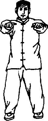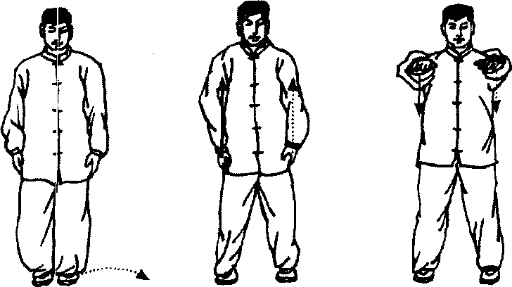 1 .预备势:并步直立,两臂放在大腿外侧;两眼平视, 精神内敛,呼吸自然(图3-⑵。