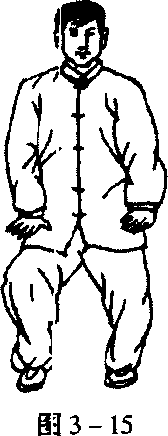 4.上体保持中正,两腿屈膝下蹲;同时两手臂下按至腹 前,手心向下,手指向前;眼看前方。此为降势(图3 - 15)。