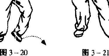 10厘米,两指尖斜向上与下额同高;随两掌相合,右脚同时 跟步于左脚跟右后侧,前脚掌着地,约距10厘米;目视前方, 定势向东南(图3 -22、3-23)。