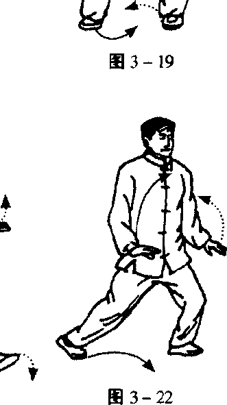 L重心移向右腿,轻提左脚向左横开步,左前脚掌先着 地,随后全脚落实,重心移向两脚中间,两脚尖向前,约与肩 同宽;目视前方(图3-⑺。