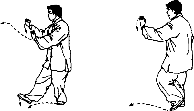 步法移动要轻灵、沉稳,上体保持中正平稳,不可起伏; 两掌向前推按要沉肘,坐腕,力注掌跟。