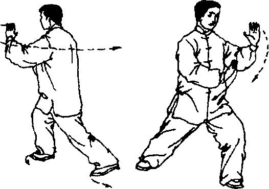 2 .右脚内扣,左脚外摆,身体左后转;重心转向左腿, 并屈膝前弓;随之两掌臂向左后平摆;眼随着左掌(图4 -