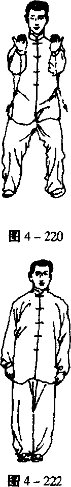 2 .两腿伸膝,身体慢慢升起;同时两掌心翻向下,徐徐 下落于大腿外侧;左脚提收与右脚并拢,身体直立;眼看前方 (图4-221、4-222)。(结束动作定势朝南,与起势相同)