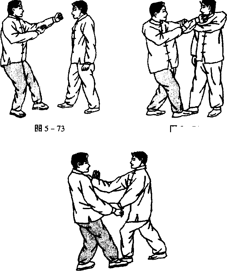 甲从乙体右侧以左拳击乙左肋部,乙上右步欲扣住甲左脚, Jz同时闪身;甲急退左步,并将左拳上勾击乙下颁,乙左手变勾向 箪 外勾挂甲左拳;甲回抽左拳,同时出右拳击乙右肋,乙则用左肘 济 下压甲右小臂,然后迅速以右掌击甲面部(图5-73 ~ 75)。武式太极拳及其防身应用74武式太极拳及其防身应用74