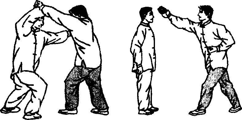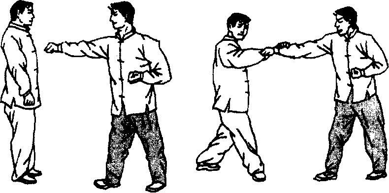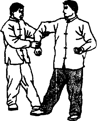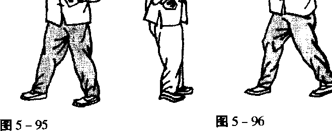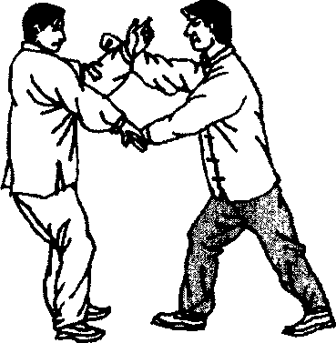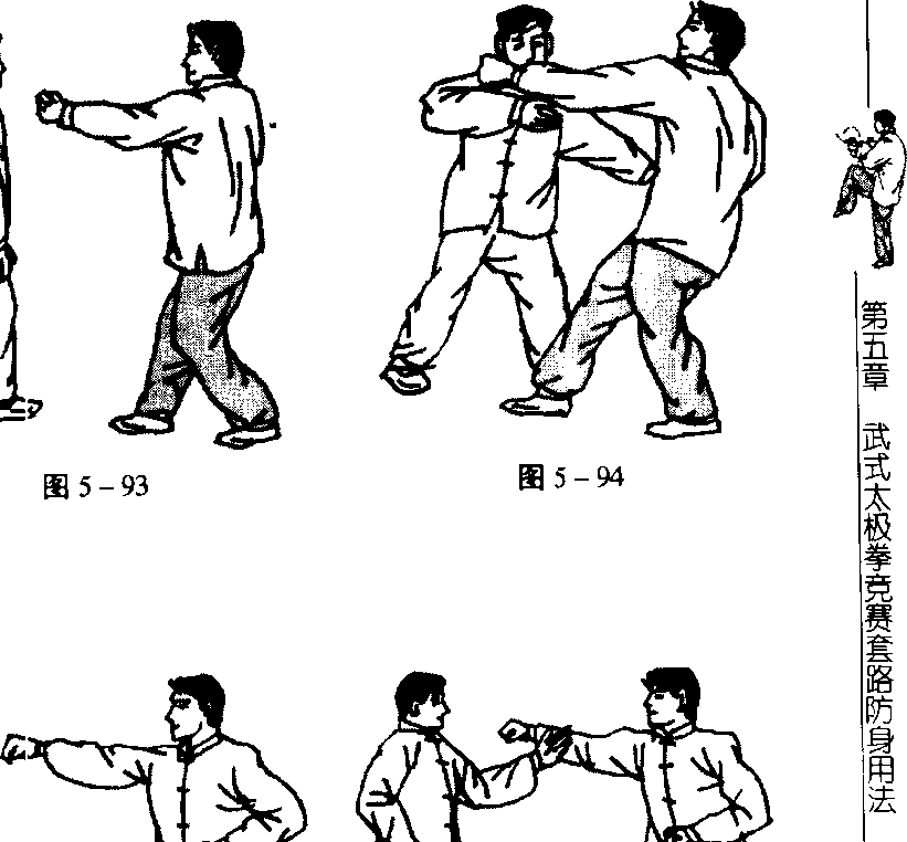 甲上右步出左拳击乙胸部,乙左脚向左前上步;同时出右 掌向右云拨甲左拳,甲刚想出右手被乙左手截住(图5-93、 5-94)o