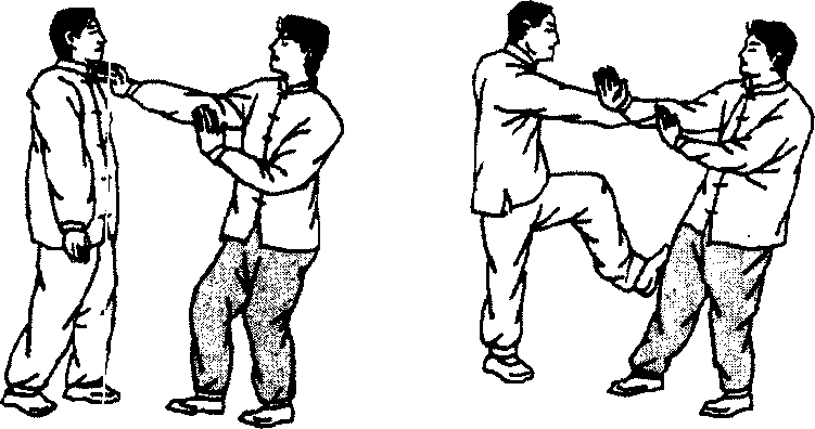 甲上右步,出右手欲掐乙喉部,乙迅速用右手拿切甲右 臂,同时出左脚用力蹬踹甲右腿(图5-88、5-89)o