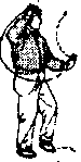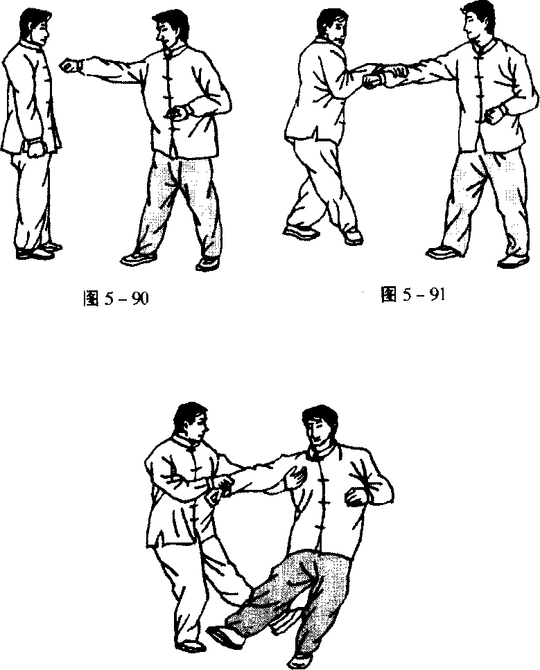 甲右脚向前上步,用右拳冲击乙胸部;乙迅速向右转身, 右脚向左前上步闪开甲右拳,然后用右手刁抓甲右手腕,向右 后下方采拉甲右手;同时左脚勾踢甲右腿,左手臂从甲右腋下 向上、向外挑拨,使其失去重心(图5-90~92)。