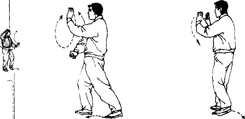 ③右手的划弧运动要由右胸支配,有迎合对方来势之意, 兼有承蓄之势;左脚跟蹬地时,右手抱虎之势要饱满,左手前 推要有沉着之势,全身上下协调一致。