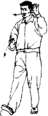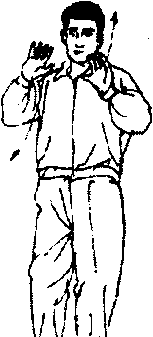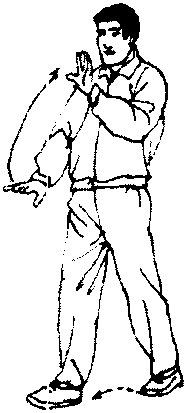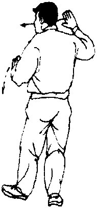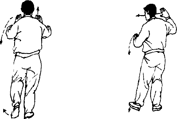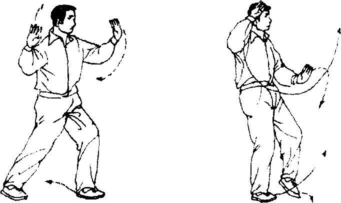 以右腿.实腿为轴转动,左手划弧略大于右手,右手下落略 慢,两手运动要有圆活之趣,松肩、沉肘。