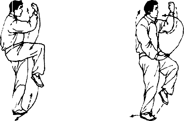 L重心在右腿,左腿向前迈步,脚跟着地,屈膝前弓, 脚掌踏实,重心前移于左脚;右腿屈膝上提,小腿垂直,成独 立步;同时右手落经右胯旁握拳,拳心向里举至齐顶,前臂竖 于右膝上;左手先向上举再自上而下按于左胯旁,手心朝下, 手指朝前;目视正东方(图6-158)。