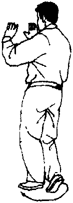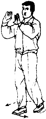1 B3 6- 160 图 6-161.左脚落于右脚后,脚前掌点地,右脚以脚跟为轴,身 体与右脚尖向左转动90度;同时两手变为竖掌向左、右分开 下落再向上划弧,随转体相对合于胸前,成推球状,高与肩 平;面对北,目平视(图6- 160)。