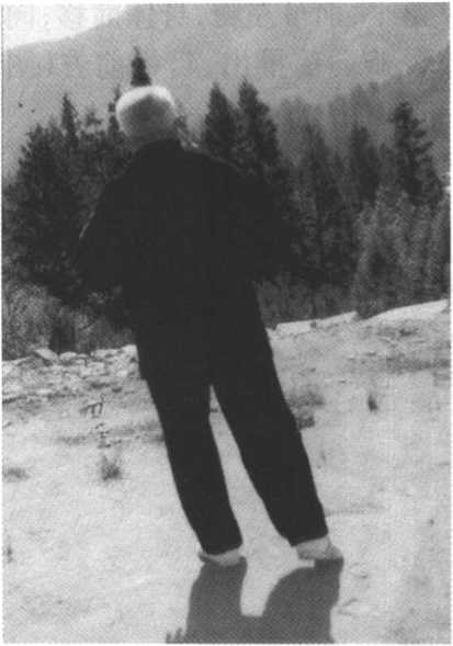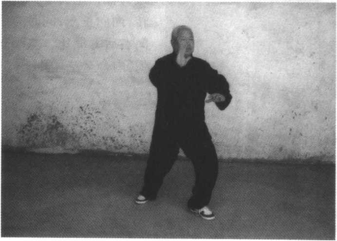 图58图58第二—式第二—式动作三:右足向前跟步, 至左足右后方,以足尖点地, 两腿为左实右虚,同时两手 内合(图58)。
