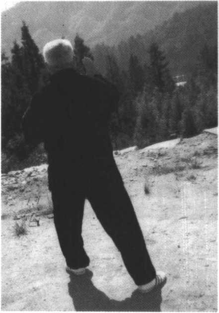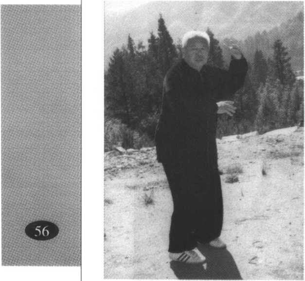动作二:右足跟蹬地,左足掌落平,前弓左腿,身体前移;同 时左手外旋随身转动,右手竖掌外旋向前推出,目视前方(图 57)O