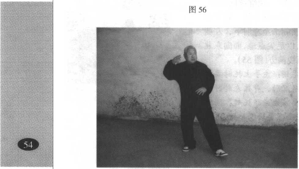 动作一:左足向左后方退步,以足趾点地,以右足跟为轴, 足尖里扣,腰向左转,左腿向西北方迈步,以足跟着地,足趾上 翘,两腿为右实左虚;同时左手内合随腰转动落至胸前,右手变 掌内合向后上划弧,提至右耳齐,面向西北方(图56)。