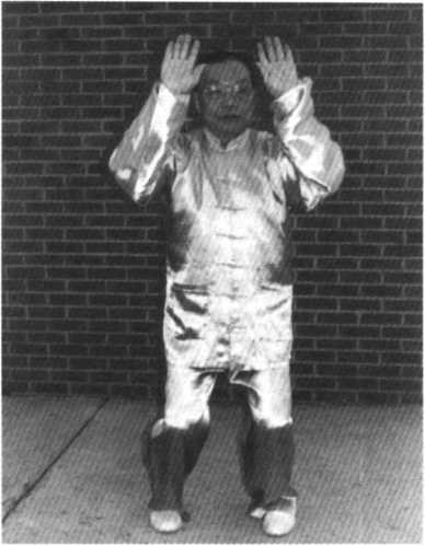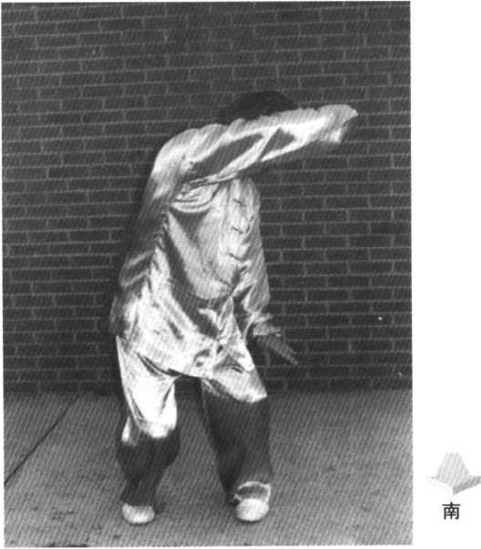 目光垂视左掌。胯裆 仍然松开,往左旋腰90。, 双手随腰握向左,维持不 动,继续望左手。维持上述 动作至左手过左胯、近臀 部。然后重心转右荡回原处, 左手顺势提起至脸前,与右手 同时扭腕,边转至双掌心朝 外,边搬回身前,向南方。整个 左右回转过程,上身毫不着 力,单靠中下(腰胯)两轴为中 心旋转,带动双臂。而眼神注 视两臂拇指间。