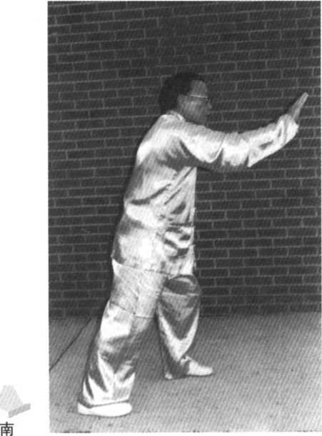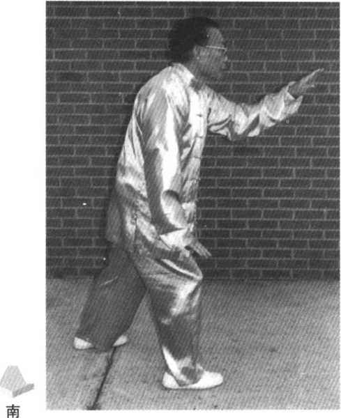东南东南随即蹬右脚,将全身 送前,左脚上步,足跟着 地;左手往左胯后搂膝,掌 心向地;左足踏实,右掌前 伸按劲。目视右掌中指根 节。如首趟“搂膝拗步”。
