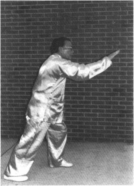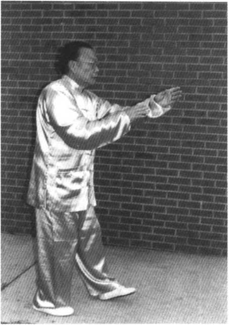 左胯旁。右手顺势由右耳旁向 胸前伸按。目视右掌中指节。