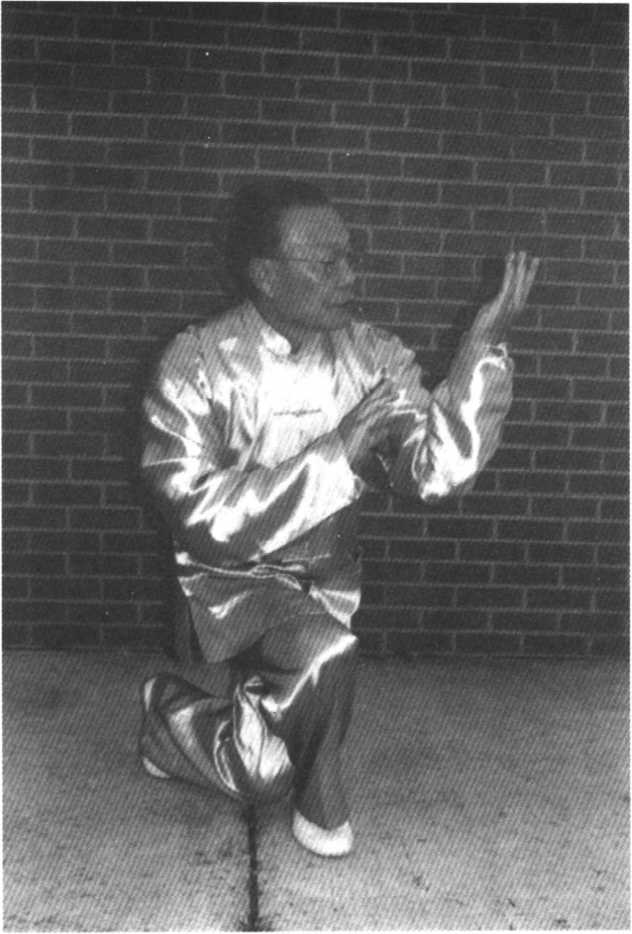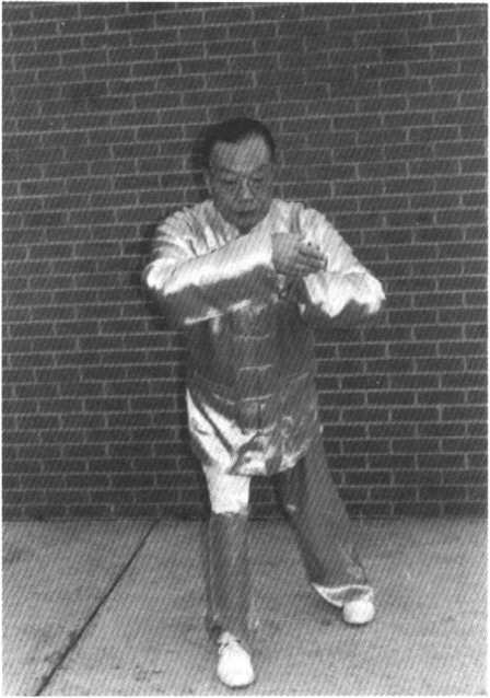 重心略左移再荡回右腿,右足足尖外撇指南,腰胯右 转90°,引领右手上提至胸前向后抽带,左手先微左旋逆时 钟边扭腕至掌心朝右,边沉至右腕下,再上穿,使两手在胸 前如抱球相对。下沉重心,屈左膝于右腿下,蹲身成卧步。 边坐边沉双肘,暨拧双腕在胸前成右掌在内、掌心向外,左 掌在外、掌心向内之形,然后右手上穿至右腕贴左肘,两手 手指朝上。目视左掌。如上图。