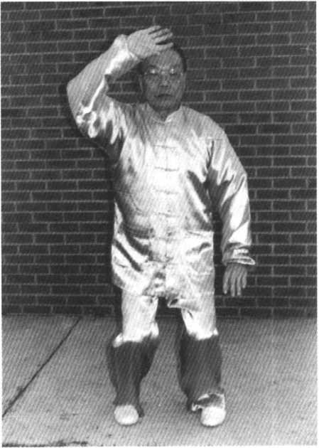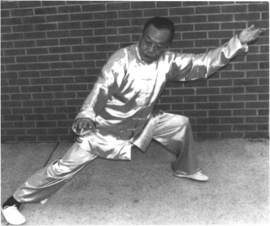 随即提起左腿,头先向左后方,视线瞅瞅落脚点,再回 望右掌;左脚向左后约30。跨步,左脚尖则外撇指往东方, 右腿亦内扣同向指东南方,然后徐徐带动腰胯往左旋30。; 同时,左臂放松,往左上方伸展,左手掌心朝外斜上;右手 亦向右前平按,掌心朝地,手指向南平伸。目视右手中指。