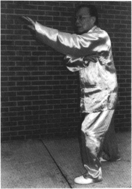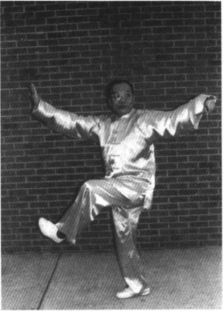 右脚提起往右后方横落 步,足尖指南。双臂随腰胯右 转,两手转至掌心向下,变十 字手齐向右正南方搬去。于 腰前分开左右动作:左手抹 向左胯前再上提,右手则向 前搠去。目视右手。右手搠至 肩齐,掌指竖起成立掌,左臂 提至肩平,五指朝下合拢成 钩。左脚提起,膝与胯平,扭 转足踝,脚心向右。左图为另 一角度图。