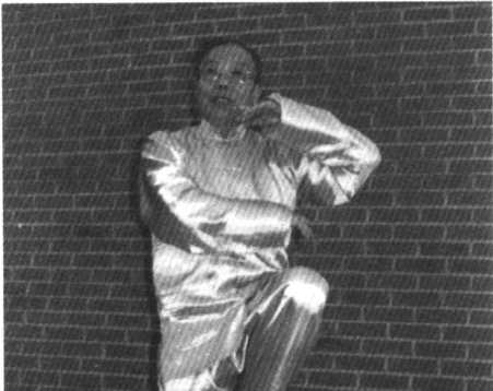 腰胯向右转90。,带引 右手收回,屈肘横臂于胸 前;左腿收回,足尖朝下; 左手回撅,左掌贴左耳 旁。