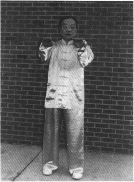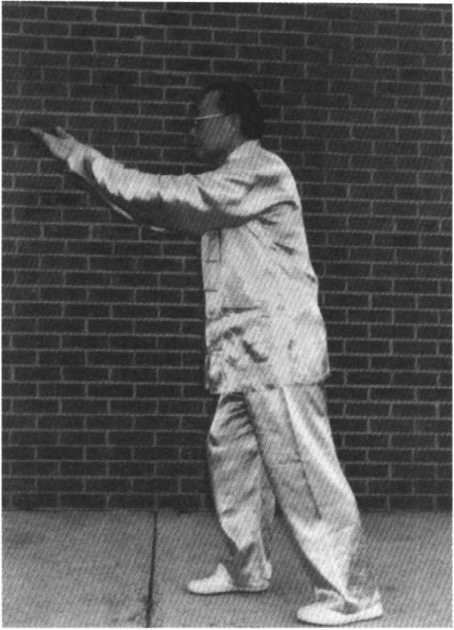 意识发动时(即“无极 生太极”工先随内气下沉 至涌泉,双足蹬地,双腕连 随转动至指掌向前,掌心 朝地,再随吸气缓缓上搠 双臂至与肩平行。内气则 上升至百会。