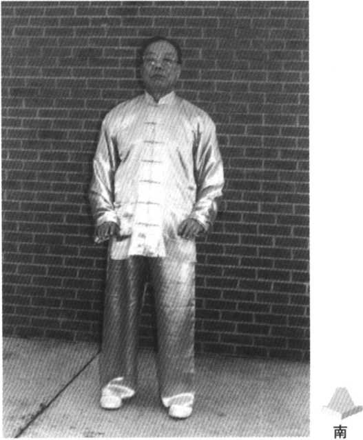 双足与肩同宽,自然 站立,双手贴身,掌指下 垂,下额微收,目睑半垂, 眼望正前方地上,全身思 想、躯体通通放松,让内 气轻轻上升,虚领顶劲, 引气至百会,然后从头顶 百会穴,下渗至脚底涌泉 穴。