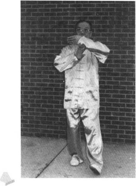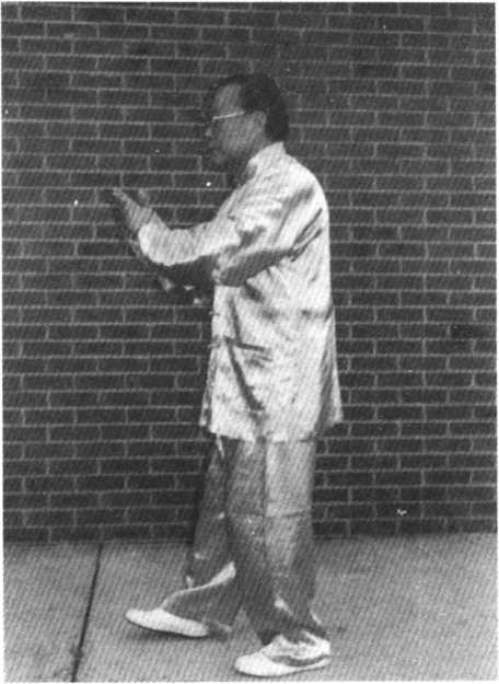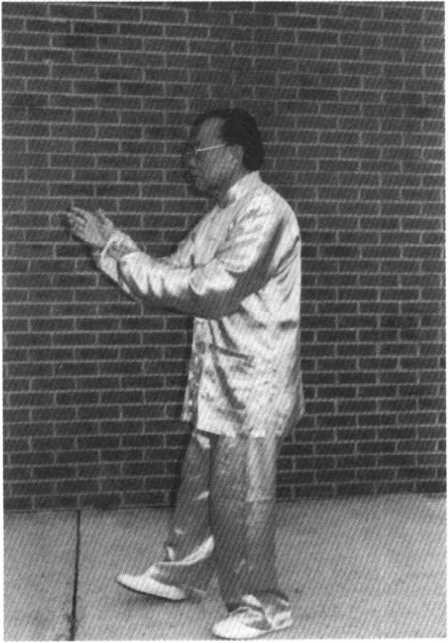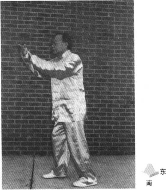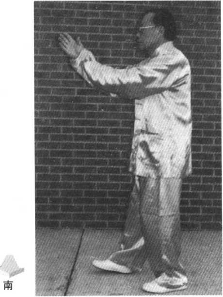 腰胯稍右转,重心荡近右 腿;两臂随吸气时,内气上升, 往身前两侧徐徐搠起,再划弧 相合于胸前。右臂边举边顺时 钟扭腕至掌心朝外,手指斜对 左上方;左手边提边逆时钟转 腕至掌心对内,手指斜对右上 方。右掌按贴左腕。同时,左脚 顺势上步,足跟着地,足尖跷 起。双手单腿一并随腰复左旋 运动,一起到位时,呼气,内气 下沉,重心荡返两腿间。两臂搠 按,暨出腿迈步,全身缓缓合成 挤势。目注左掌。