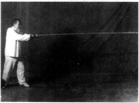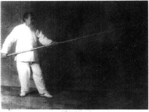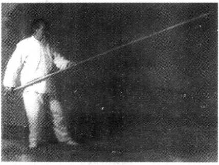 动作1:上动不停,右手活把杆稍回抽,杆身仍有合按之 意,坐实右腿,蓄劲待发,面向正东(见图13)o动作2:承前式,重心前移,成左弓右蹬步,双手合力向前 平捅刺,力达杆尖,面向正东(见图14)。图13第10式宿鸟归巢动作:承前式,重心前移,右脚跟步随即后撤,稍后左脚也 收退到右脚前,同时双手持杆随身体重心后坐于右腿时右手沉腕 下压,左手在上持杆斜竖胸前,面向正东(见图15)。图15