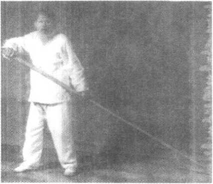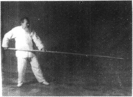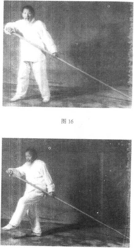 动作I:承前式,上动不停,身向左转后坐实右腿,双手持 杆按落至腰间,敛神凝气,浑然一体,杆尖稍低,形如捕鼠,面 向东(见图19兀