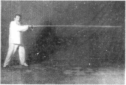 动作2:承前式.重心前移左腿,成左弓右蹬步,双手拧杆 前捅,力达杆尖,目向杆尖平视(见图20)。