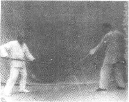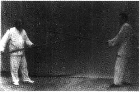 动作:甲用 杆顺势下刺乙的 脚面,同时左腿 向前迈进一步, 乙右腿向后退 步,同时向右把 甲杆拨开(见图 34、图 35)。合带之力右腿跟进半步,乙乘甲跟进之劲左腿收回半步(见图38) o图38甲进剌乙三步半后,改为乙进刺甲(同样为三步半),攻、 防和以上一样,如此循环进行对练。