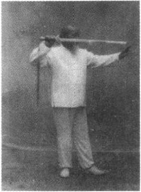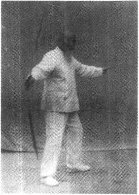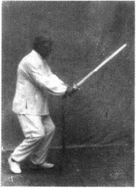 坐腕竖指朝向正东(见图3)。动作I:左脚向东北方向迈 出,重心渐移至左腿,剑向右后 劈落(见图4)。图3动作2:承前式,上动不停,右 手剑继续弧形劈落,再从下向左前 绷起,剑尖上下锋分明,绷剑的同时 右脚跟至左脚斜后?方,目凝视剑尖, 力达剑尖。面向正东(见图5)。图3