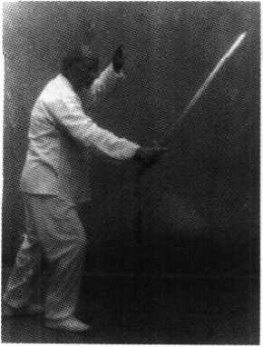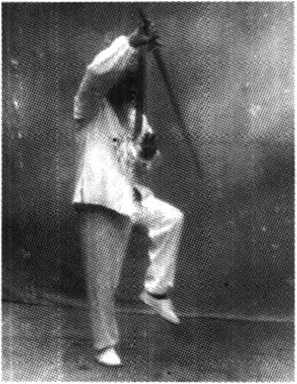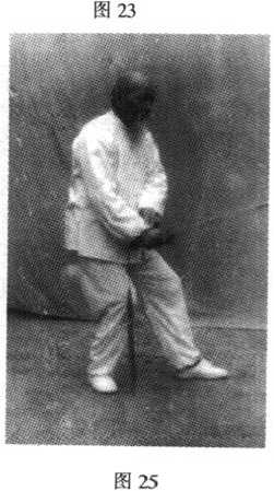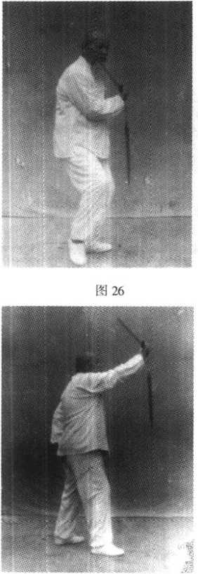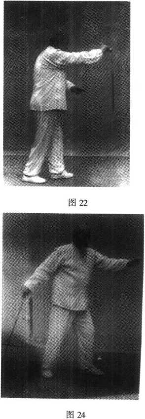 图21动作:由前式,身凝气上 拔,左腿在剑向上提起的同时 屈膝上提,剑身斜竖身前,目 视剑尖,左手坐腕竖指于胸前 (见图21)0第9式左右劈剑动作1:由前式,左脚前落,重心随移左腿,右手剑向左后 勾裹,左剑指沉至腹部(见图22)。动作2:由前式,右脚前迈,身体重心随移右腿,右手剑从 左后向前抡劈,左剑指向左后划弧一周配合抡劈。面向东南(见 图 23)O动作3:由前式,剑向右后甩,右脚随后撤步,眼看剑指 (见图24)。动作4:由前式,身体重心移右腿,左脚回抽虚点左前方, 同时剑从右向左劈至身右前侧,力达剑身(见图25)。