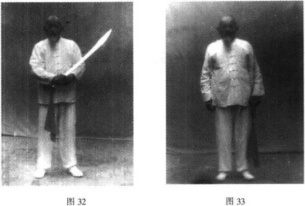 动作3:由前式,左脚向右内靠拢,平心静气,环式收刀, 怀中抱月,目光海重,平视正南(见图32)。