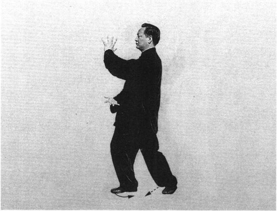 身体方向不变,重心前移至右腿;左脚随即 上半步,落于右脚后方,前脚掌点地。同时,左 掌由腹前经右肘内侧向前、向上弧形穿出,置于 面前成立掌,掌心向左,掌指朝上,高不过眼, 远不过脚;右掌在面前弧形下落于脐前一拳左 右,掌心向上,双掌上下垂直(图15)。