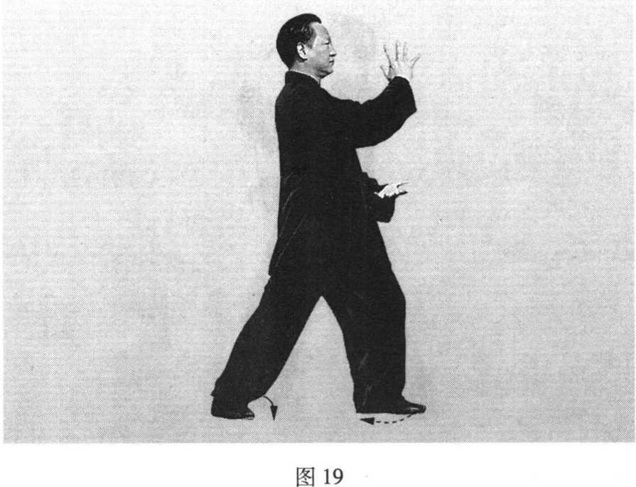 动作五:重心左移,左腿屈膝前弓,右腿自然伸直成 左弓步,身体左转90。。同时,双掌随转体姿势 不变(图18)。太一^——拳———书太一^——拳———书动作六:下身不动。右掌从腹前经左肘内侧向前、向 上弧形穿出至面前成立掌,高不过眼,远不过 脚;同时,左掌弧形下落于肚脐前一拳左右,掌 心向上(图19)。图20武式太极拳十三图20武式太极拳十三动作七: